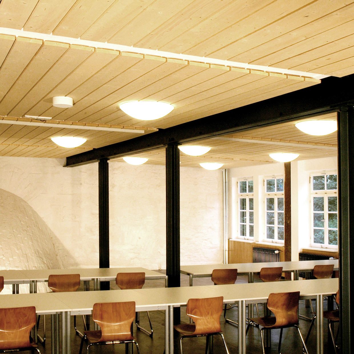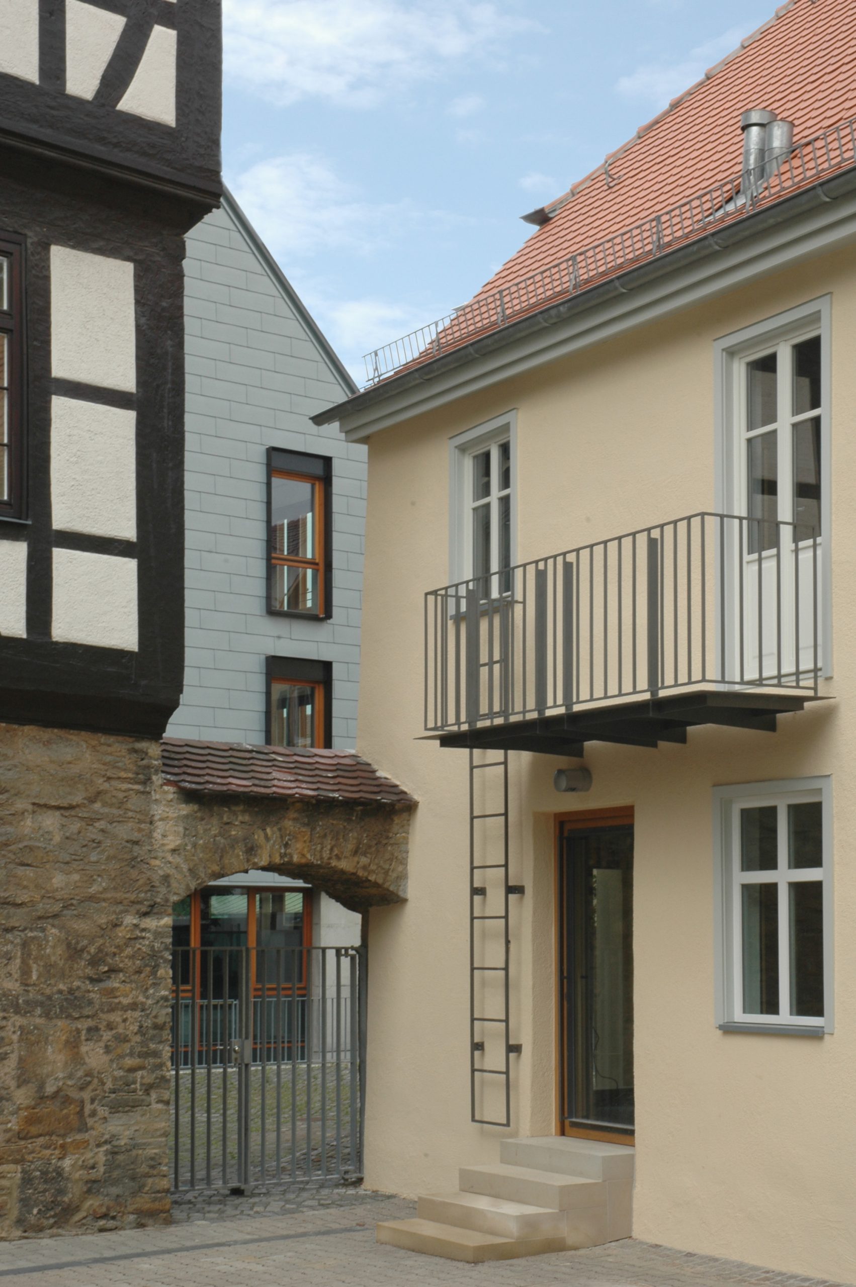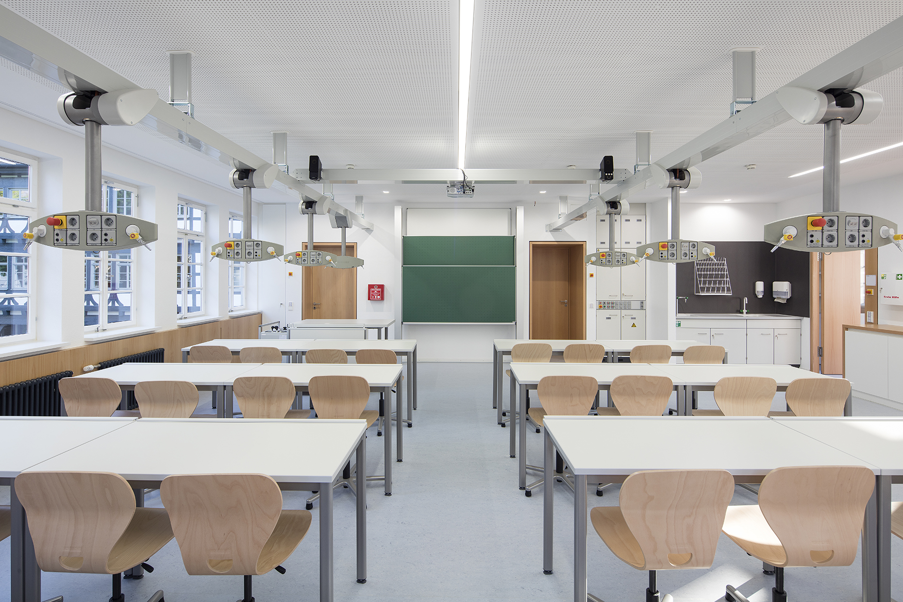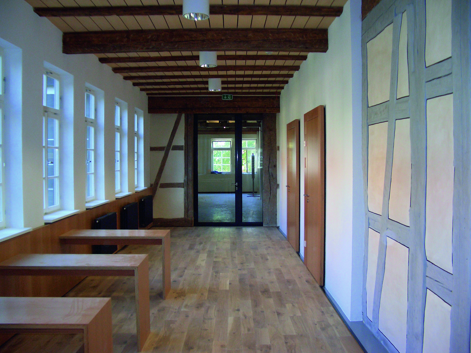 Das mittelalterliche Fachwerkgebäude hat eine Geschichte, die bis ins Jahr 1540 zurückreicht. Die Bauarbeiten unterteilten sich in mehrere Abschnitte. In enger Abstimmung mit der Denkmalschutzbehörde wurden Lösungen gesucht, die den Grundgedanken des Umbaukonzeptes der Bewahrung und Freilegung von historischen Strukturen im Rahmen der finanziellen Möglichkeiten zum Ausdruck brachten. Zudem galt es, freundlichere und hellere Innenräume zu erhalten. Für das alte Hausmeisterhäuschen wurde eine Mensa eingerichtet und ehemalige Klassenräume in ei-nen Mehrzweckraum umgebaut. In einem weiteren Schritt wurden in den Jahren 2016/17 die ehemaligen Biologieräume für die Nutzung als NWT Fachklassen umgebaut. Bei der Wahl der Konstruktionen und Materialien wurde beabsichtigt, ein Gebäude zu errichten, das die Strukturen des Bestandes respektiert, sich aber als eigenständiges Bauwerk seiner Zeit darstellt.