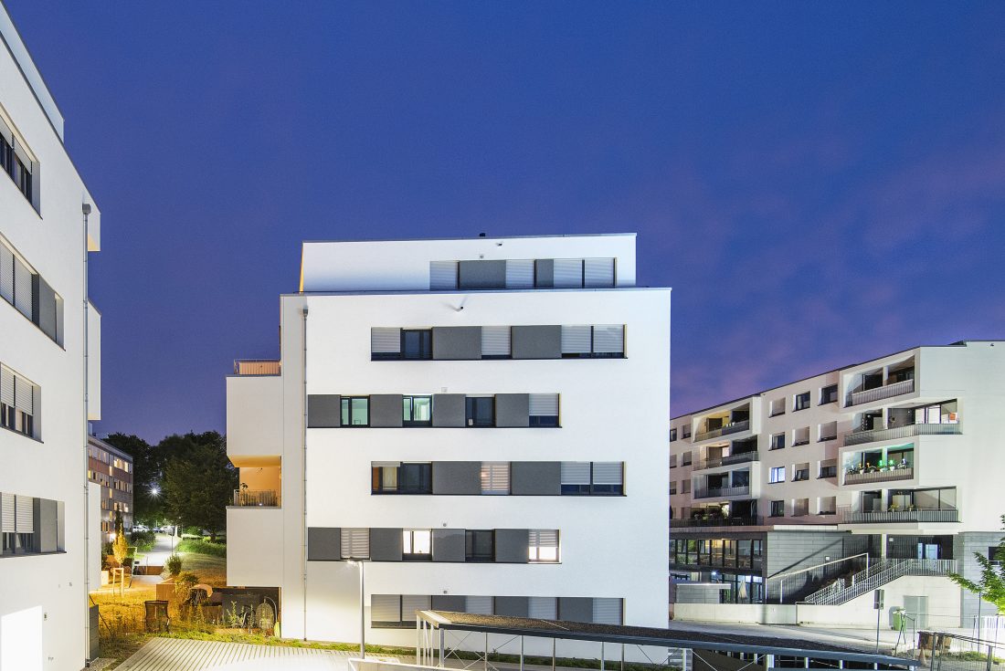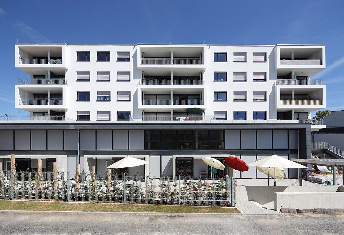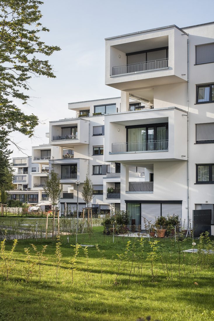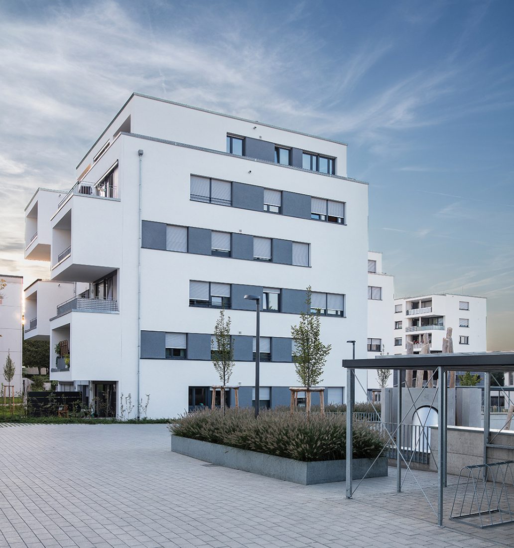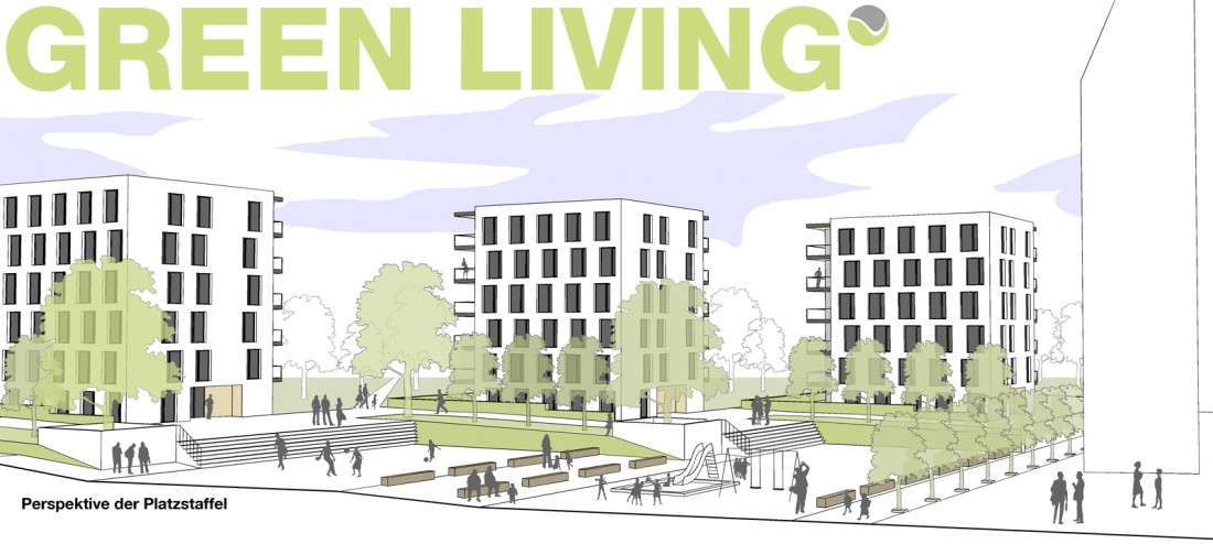 Die Kirche soll ihre stadtbildprägende Stellung behalten und von allen Seiten gut einsehbar bleiben. Eine Zeilenbebauung im Norden schließt das Baugebiet zur Straße ab und stellt nach Süden eine Schallbarriere dar. Die öffentlichen Spielplatzflächen bilden eine Höhenkante, sodass sich die Zugangsbereiche der Punkthäuser als halböffentliche Bereiche darstellen. An die südlichen und westlichen Gebäudeseiten wird der Park an die Freibereiche der Wohnungen herangeführt. Nach der Einweihung des Kinderhauses im Dezember 2013 werden ab 2014 die vier weiteren Punkthäuser errichtet. Die innere Struktur ist so aufgebaut, dass Zwei- und Dreispänner sich in den Geschossen abwechseln und somit ein breit gefächertes Angebot von Wohnungsgrößen und –grundrissen entsteht. Dadurch kann auf die differenzierten Lebens- und Wohnvorstellungen der Bewohner reagiert werden. Die Balkone und Loggien folgen diesem geschossweisen Versatz und minimieren die Einblicke zugunsten einer großen Privatheit der Außenräume.