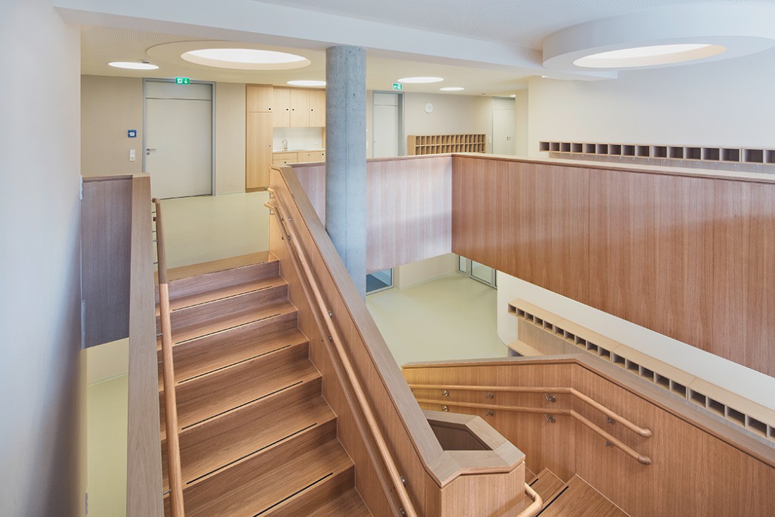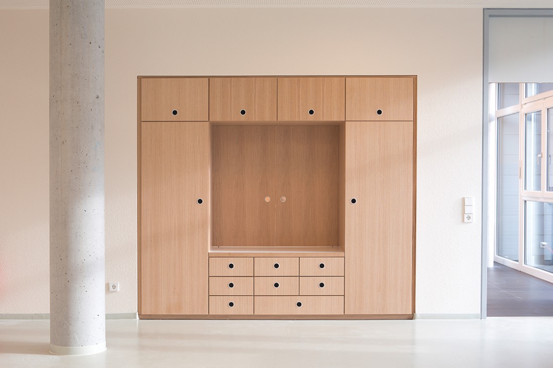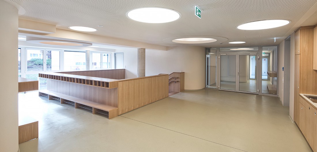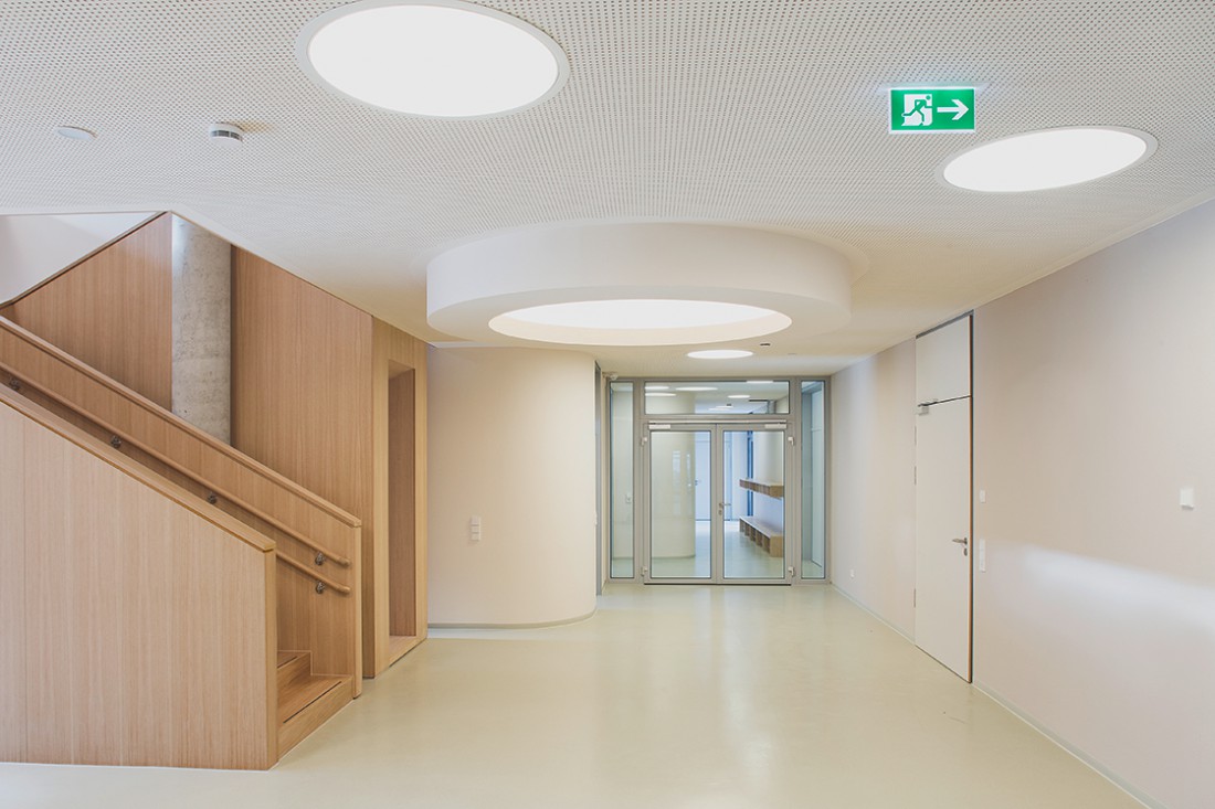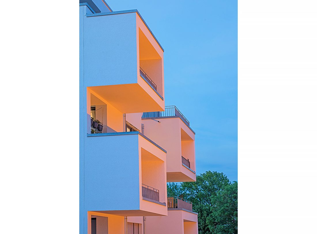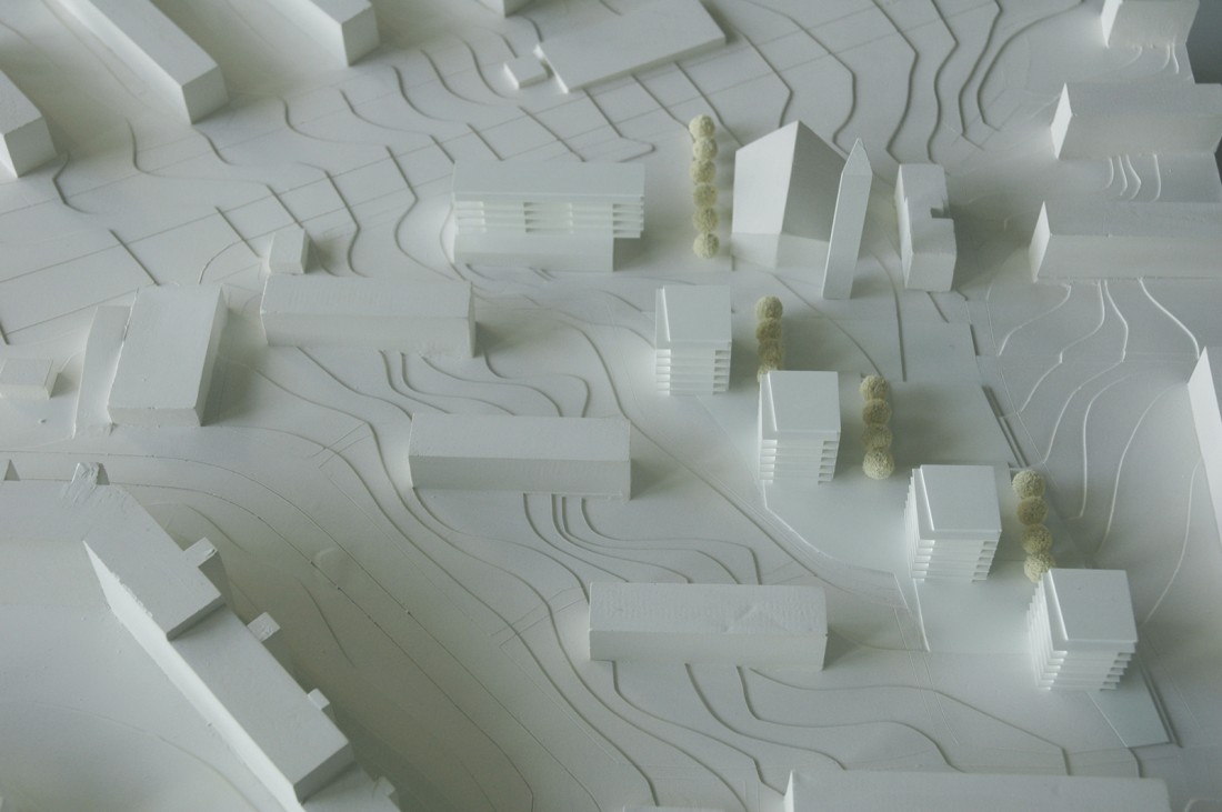 Die Kirche soll ihre stadtbildprägende Stellung behalten und von allen Seiten gut einsehbar bleiben. Eine Zeilenbebauung im Norden schließt das Baugebiet zur Straße ab und stellt nach Süden eine Schallbarriere dar. Die öffentlichen Spielplatzflächen bilden eine Höhenkante, sodass sich die Zugangsbereiche der Punkthäuser als halböffentliche Bereiche darstellen. An die südlichen und westlichen Gebäudeseiten wird der Park an die Freibereiche der Wohnungen herangeführt. Nach der Einweihung des Kinderhauses im Dezember 2013 werden ab 2014 die vier weiteren Punkthäuser errichtet. Die innere Struktur ist so aufgebaut, dass Zwei- und Dreispänner sich in den Geschossen abwechseln und somit ein breit gefächertes Angebot von Wohnungsgrößen und –grundrissen entsteht. Dadurch kann auf die differenzierten Lebens- und Wohnvorstellungen der Bewohner reagiert werden. Die Balkone und Loggien folgen diesem geschossweisen Versatz und minimieren die Einblicke zugunsten einer großen Privatheit der Außenräume.